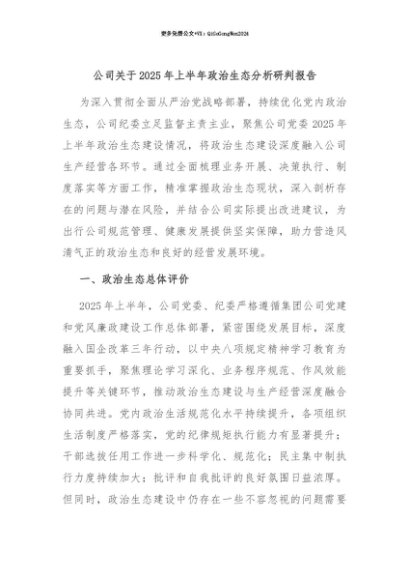 【七哥公文】2025年:【七哥公文】公司关于2025年上半年政治生态分析研判报告+更多免费公文+VX:QiGeGongWen2024+更多免费公文+VX:QiGeGongWen2024