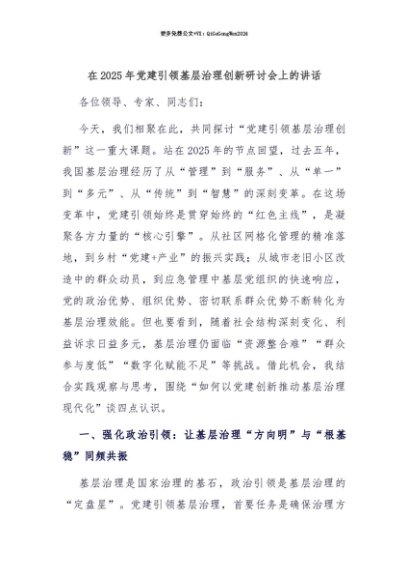 【七哥公文】2025年:【七哥公文】在2025年党建引领基层治理创新研讨会上的讲话+更多免费公文+VX:QiGeGongWen2024+更多免费公文+VX:QiGeGongWen2024