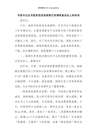 【七哥公文】2025年:【七哥公文】市委书记在市投资促进局招商引资调研座谈会上的讲话+更多免费公文+VX:QiGeGongWen2024+更多免费公文+VX:QiGeGongWen2024