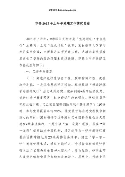 【七哥公文】2025年:【七哥公文】市委2025年上半年党建工作情况总结+更多免费公文+VX:QiGeGongWen2024+更多免费公文+VX:QiGeGongWen2024