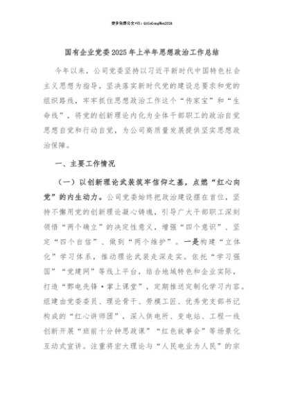 【七哥公文】2025年:【七哥公文】国有企业党委2025年上半年思想政治工作总结+更多免费公文+VX:QiGeGongWen2024+更多免费公文+VX:QiGeGongWen2024