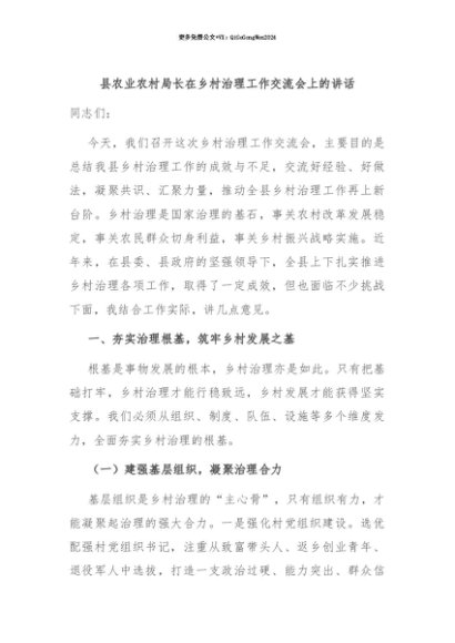 【七哥公文】2025年:【七哥公文】县农业农村局长在乡村治理工作交流会上的讲话+更多免费公文+VX:QiGeGongWen2024+更多免费公文+VX:QiGeGongWen2024