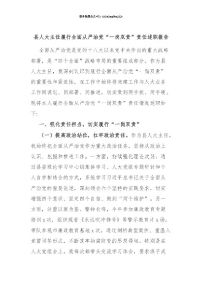 【七哥公文】2025年:【七哥公文】县人大主任履行全面从严治党“一岗双责”责任述职报告+更多免费公文+VX:QiGeGongWen2024+更多免费公文+VX:QiGeGongWen2024