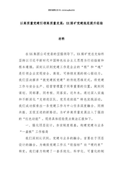 【七哥公文】2025年:【七哥公文】以高质量党建引领高质量发展:XX煤矿党建规范提升经验材料+更多免费公文+VX:QiGeGongWen2024+更多免费公文+VX:QiGeGongWen2024