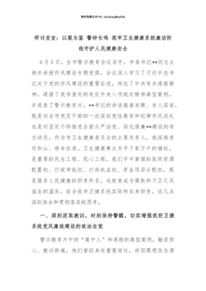【七哥公文】2025年:【七哥公文】研讨发言:以案为鉴 警钟长鸣 筑牢卫生健康系统廉洁防线守护人民健康安全+更多免费公文+VX:QiGeGongWen2024+更多免费公文+VX:QiGeGongWen2024