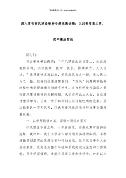 【七哥公文】2025年:【七哥公文】深入贯彻作风建设精神专题党课讲稿:以刮骨疗毒之勇,筑牢廉洁防线+更多免费公文+VX:QiGeGongWen2024+更多免费公文+VX:QiGeGongWen2024