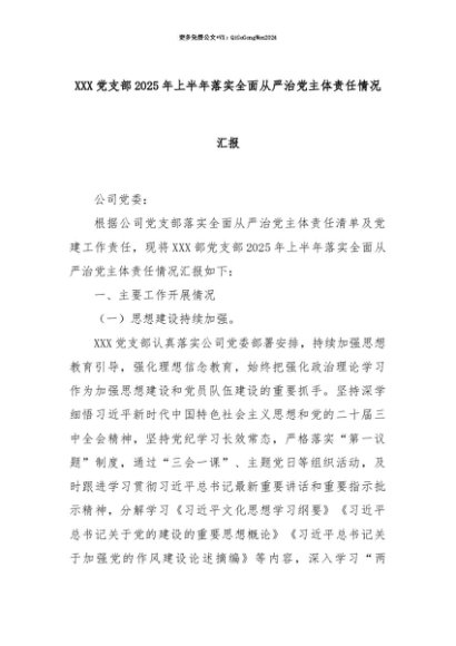【七哥公文】2025年:【七哥公文】XXX党支部2025年上半年落实全面从严治党主体责任情况汇报+更多免费公文+VX:QiGeGongWen2024+更多免费公文+VX:QiGeGongWen2024
