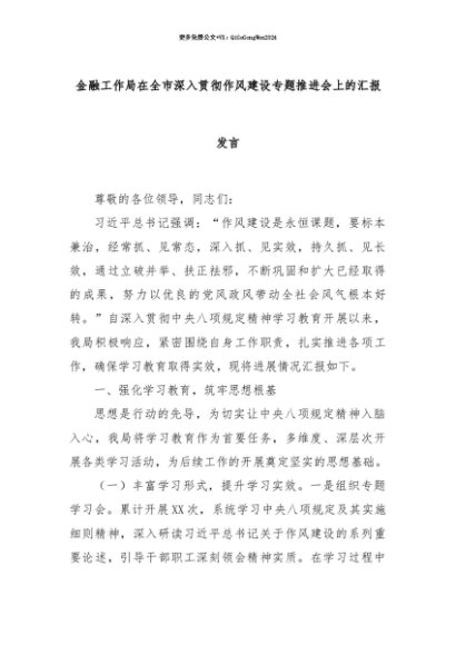 【七哥公文】2025年:【七哥公文】金融工作局在全市深入贯彻作风建设专题推进会上的汇报发言+更多免费公文+VX:QiGeGongWen2024+更多免费公文+VX:QiGeGongWen2024