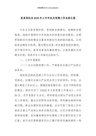 【七哥公文】2025年:【七哥公文】某某局机关 2025 年上半年机关党建工作总结汇报+更多免费公文+VX:QiGeGongWen2024+更多免费公文+VX:QiGeGongWen2024