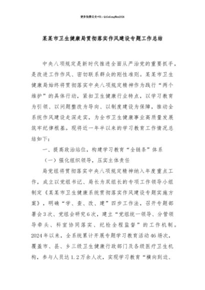 【七哥公文】2025年:【七哥公文】某某市卫生健康局贯彻落实作风建设专题工作总结+更多免费公文+VX:QiGeGongWen2024+更多免费公文+VX:QiGeGongWen2024