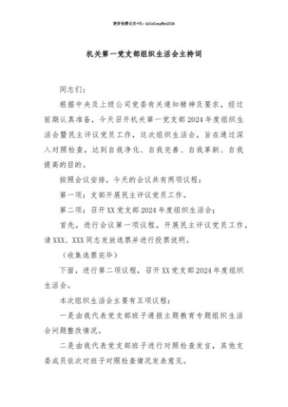 【七哥公文】2025年:【七哥公文】机关第一党支部组织生活会主持词+更多免费公文+VX:QiGeGongWen2024+更多免费公文+VX:QiGeGongWen2024