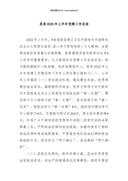 【七哥公文】2025年:【七哥公文】某局 2025 年上半年党建工作总结+更多免费公文+VX:QiGeGongWen2024+更多免费公文+VX:QiGeGongWen2024