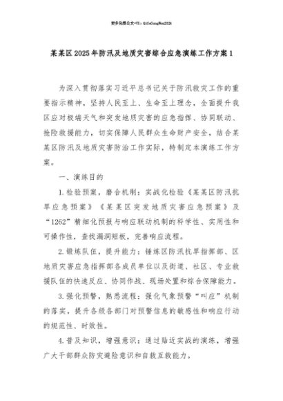 【七哥公文】2025年:【七哥公文】某某区2025年防汛及地质灾害综合应急演练工作方案1+更多免费公文+VX:QiGeGongWen2024+更多免费公文+VX:QiGeGongWen2024