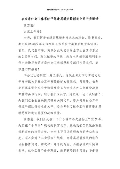 【七哥公文】2025年:【七哥公文】在全市社会工作系统干部素质提升培训班上的开班讲话+更多免费公文+VX:QiGeGongWen2024+更多免费公文+VX:QiGeGongWen2024