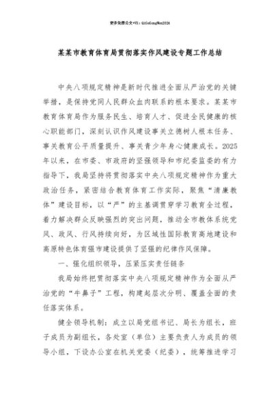【七哥公文】2025年:【七哥公文】某某市教育体育局贯彻落实作风建设专题工作总结+更多免费公文+VX:QiGeGongWen2024+更多免费公文+VX:QiGeGongWen2024