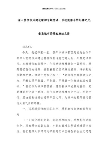 【七哥公文】2025年:【七哥公文】深入贯彻作风建设精神专题党课:以铁规禁令的纪律之尺,量准城市治理的廉洁之路+更多免费公文+VX:QiGeGongWen2024+更多免费公文+VX:QiGeGongWen2024