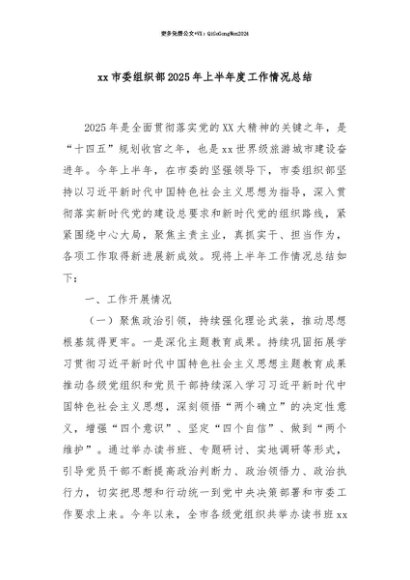 【七哥公文】2025年:【七哥公文】xx市委组织部2025年上半年度工作情况总结+更多免费公文+VX:QiGeGongWen2024+更多免费公文+VX:QiGeGongWen2024