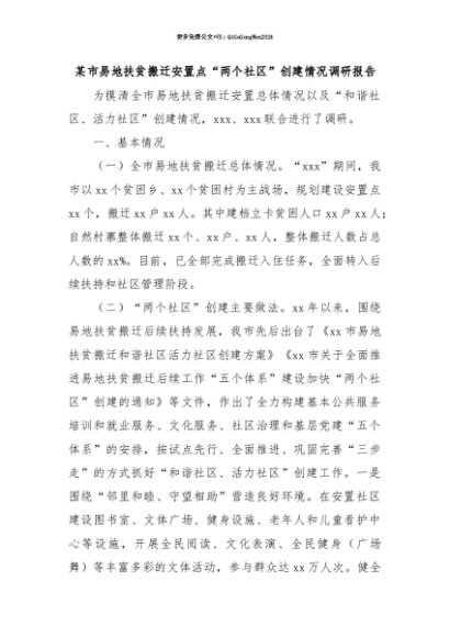 【七哥公文】2025年:【七哥公文】某市易地扶贫搬迁安置点“两个社区”创建情况调研报告+更多免费公文+VX:QiGeGongWen2024+更多免费公文+VX:QiGeGongWen2024