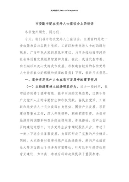 【七哥公文】2025年:【七哥公文】市委副书记在党外人士座谈会上的讲话+更多免费公文+VX:QiGeGongWen2024+更多免费公文+VX:QiGeGongWen2024