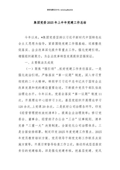 【七哥公文】2025年:【七哥公文】集团党委 2025 年上半年党建工作总结+更多免费公文+VX:QiGeGongWen2024+更多免费公文+VX:QiGeGongWen2024