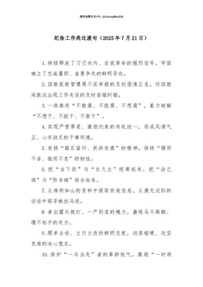 【七哥公文】2025年:【七哥公文】纪检工作类过渡句(2025年7月21日)+更多免费公文+VX:QiGeGongWen2024+更多免费公文+VX:QiGeGongWen2024