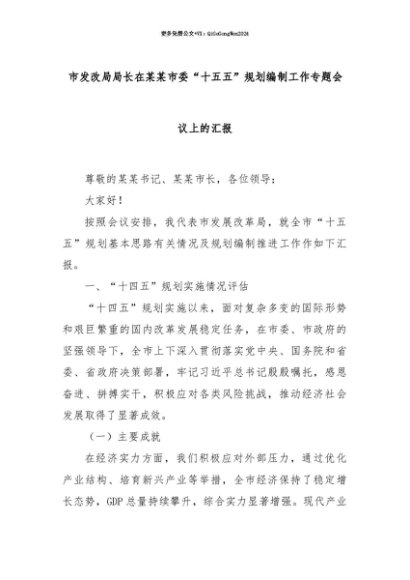 【七哥公文】2025年:【七哥公文】市发改局局长在某某市委“十五五”规划编制工作专题会议上的汇报+更多免费公文+VX:QiGeGongWen2024+更多免费公文+VX:QiGeGongWen2024
