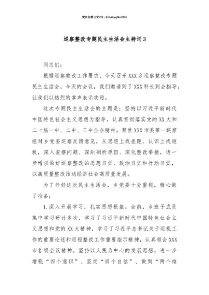 【七哥公文】2025年:【七哥公文】巡察整改专题民主生活会主持词3+更多免费公文+VX:QiGeGongWen2024+更多免费公文+VX:QiGeGongWen2024