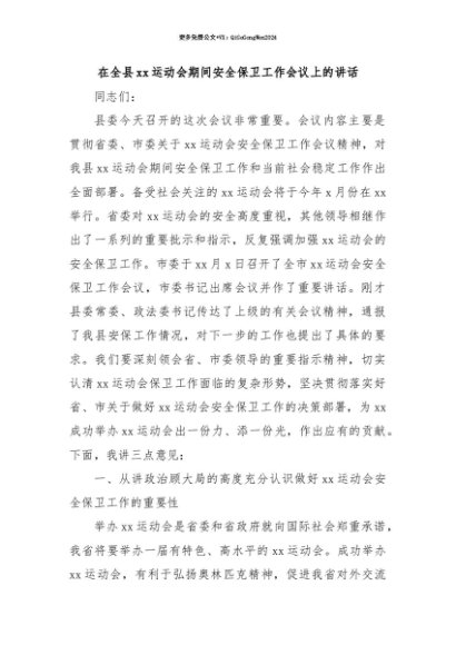 【七哥公文】2025年:【七哥公文】在全县xx运动会期间安全保卫工作会议上的讲话+更多免费公文+VX:QiGeGongWen2024+更多免费公文+VX:QiGeGongWen2024