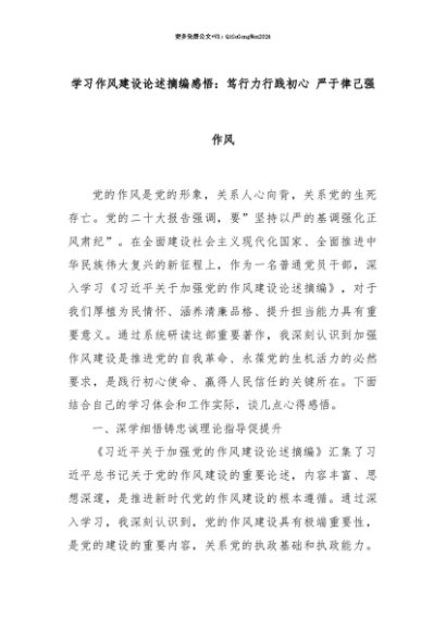 【七哥公文】2025年:【七哥公文】学习作风建设论述摘编感悟:笃行力行践初心 严于律己强作风+更多免费公文+VX:QiGeGongWen2024+更多免费公文+VX:QiGeGongWen2024