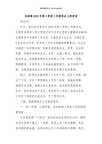 【七哥公文】2025年:【七哥公文】在街道2025年第三季度工作推进会上的讲话+更多免费公文+VX:QiGeGongWen2024+更多免费公文+VX:QiGeGongWen2024