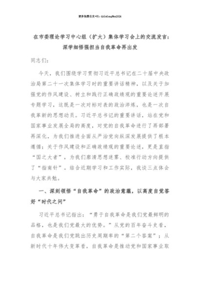 【七哥公文】2025年:【七哥公文】在市委理论学习中心组(扩大)集体学习会上的交流发言:深学细悟强担当自我革命再出发+更多免费公文+VX:QiGeGongWen2024+更多免费公文+VX:QiGeGongWen2024