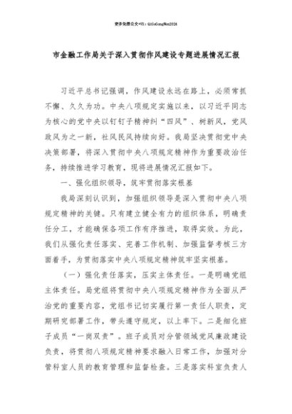 【七哥公文】2025年:【七哥公文】市金融工作局关于深入贯彻作风建设专题进展情况汇报+更多免费公文+VX:QiGeGongWen2024+更多免费公文+VX:QiGeGongWen2024
