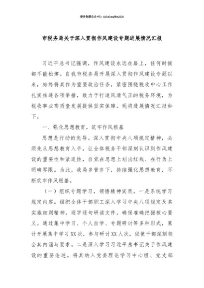 【七哥公文】2025年:【七哥公文】市税务局关于深入贯彻作风建设专题进展情况汇报+更多免费公文+VX:QiGeGongWen2024+更多免费公文+VX:QiGeGongWen2024