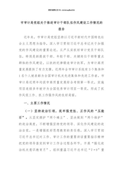 【七哥公文】2025年:【七哥公文】市审计局党组关于推进审计干部队伍作风建设工作情况的报告+更多免费公文+VX:QiGeGongWen2024+更多免费公文+VX:QiGeGongWen2024