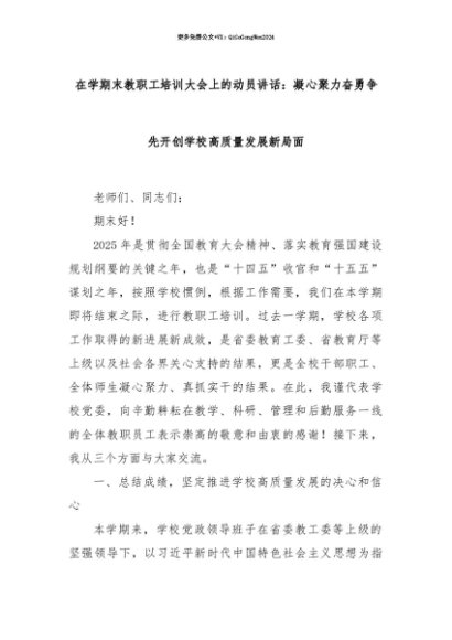 【七哥公文】2025年:【七哥公文】在学期末教职工培训大会上的动员讲话:凝心聚力奋勇争先开创学校高质量发展新局面+更多免费公文+VX:QiGeGongWen2024+更多免费公文+VX:QiGeGongWen2024