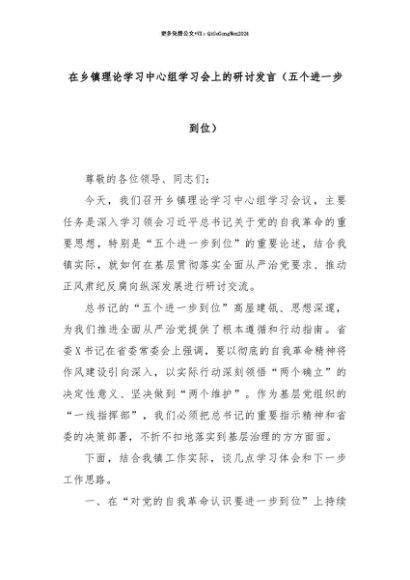 【七哥公文】2025年:【七哥公文】在乡镇理论学习中心组学习会上的研讨发言(五个进一步到位)+更多免费公文+VX:QiGeGongWen2024+更多免费公文+VX:QiGeGongWen2024