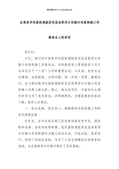【七哥公文】2025年:【七哥公文】在某某市巩固拓展脱贫攻坚成果同乡村振兴有效衔接工作推进会上的讲话+更多免费公文+VX:QiGeGongWen2024+更多免费公文+VX:QiGeGongWen2024