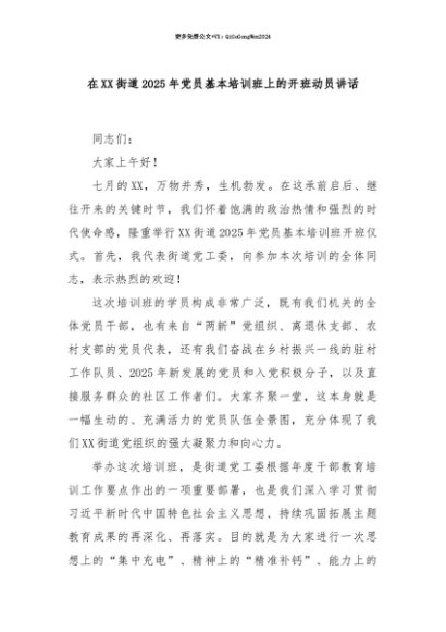 【七哥公文】2025年:【七哥公文】在XX街道2025年党员基本培训班上的开班动员讲话+更多免费公文+VX:QiGeGongWen2024+更多免费公文+VX:QiGeGongWen2024
