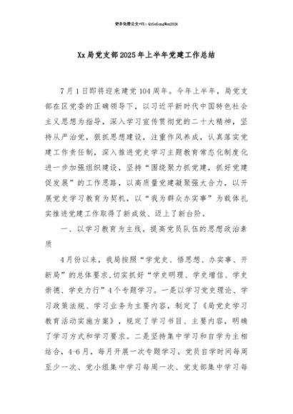 【七哥公文】2025年:【七哥公文】Xx局党支部2025年上半年党建工作总结+更多免费公文+VX:QiGeGongWen2024+更多免费公文+VX:QiGeGongWen2024
