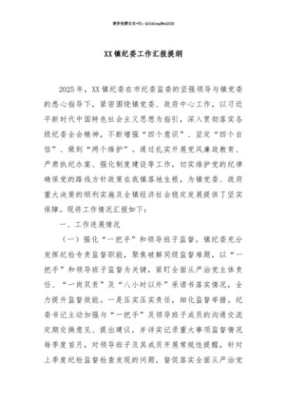 【七哥公文】2025年:【七哥公文】XX镇纪委工作汇报提纲+更多免费公文+VX:QiGeGongWen2024+更多免费公文+VX:QiGeGongWen2024