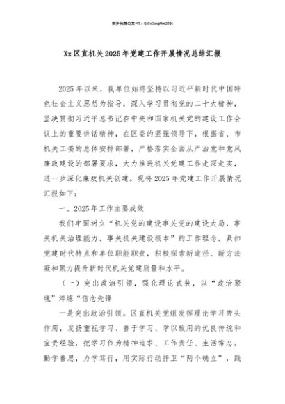 【七哥公文】2025年:【七哥公文】Xx区直机关2025年党建工作开展情况总结汇报+更多免费公文+VX:QiGeGongWen2024+更多免费公文+VX:QiGeGongWen2024