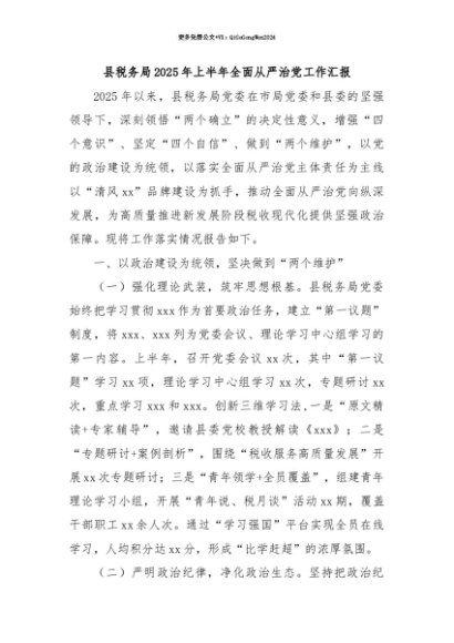 【七哥公文】2025年:【七哥公文】县税务局2025年上半年全面从严治党工作汇报+更多免费公文+VX:QiGeGongWen2024+更多免费公文+VX:QiGeGongWen2024