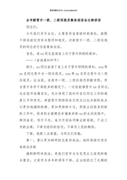 【七哥公文】2025年:【七哥公文】全市新晋升一级、二级巡视员集体谈话会主持讲话+更多免费公文+VX:QiGeGongWen2024+更多免费公文+VX:QiGeGongWen2024