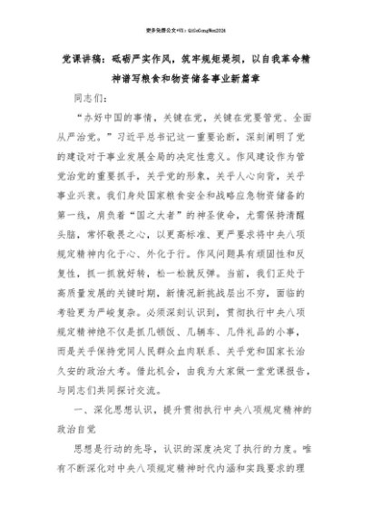 【七哥公文】2025年:【七哥公文】党课讲稿:砥砺严实作风,筑牢规矩堤坝,以自我革命精神谱写粮食和物资储备事业新篇章+更多免费公文+VX:QiGeGongWen2024+更多免费公文+VX:QiGeGongWen2024