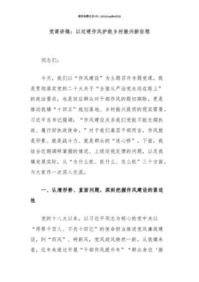 【七哥公文】2025年:【七哥公文】党课讲稿:以过硬作风护航乡村振兴新征程+更多免费公文+VX:QiGeGongWen2024+更多免费公文+VX:QiGeGongWen2024