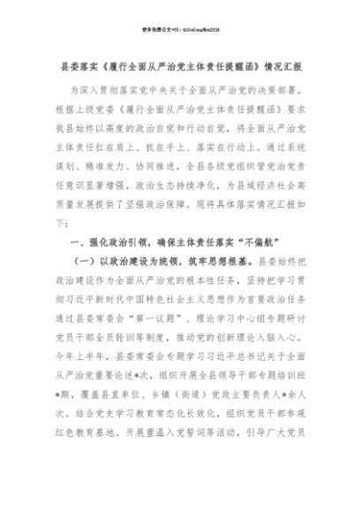 【七哥公文】2025年:【七哥公文】县委落实《履行全面从严治党主体责任提醒函》情况汇报+更多免费公文+VX:QiGeGongWen2024+更多免费公文+VX:QiGeGongWen2024