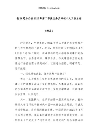 【七哥公文】2025年:【七哥公文】县XX局办公室2025年第二季度公务员考核个人工作总结(精品)+更多免费公文+VX:QiGeGongWen2024+更多免费公文+VX:QiGeGongWen2024
