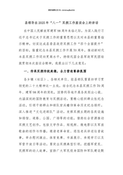 【七哥公文】2025年:【七哥公文】县领导在2025年“八一”双拥工作座谈会上的讲话+更多免费公文+VX:QiGeGongWen2024+更多免费公文+VX:QiGeGongWen2024
