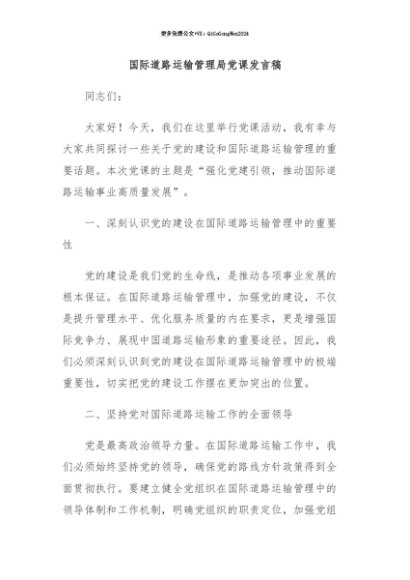 【七哥公文】2025年:【七哥公文】国际道路运输管理局党课发言稿+更多免费公文+VX:QiGeGongWen2024+更多免费公文+VX:QiGeGongWen2024