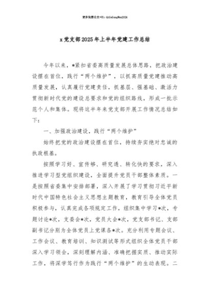 【七哥公文】2025年:【七哥公文】x党支部 2025 年上半年党建工作总结+更多免费公文+VX:QiGeGongWen2024+更多免费公文+VX:QiGeGongWen2024